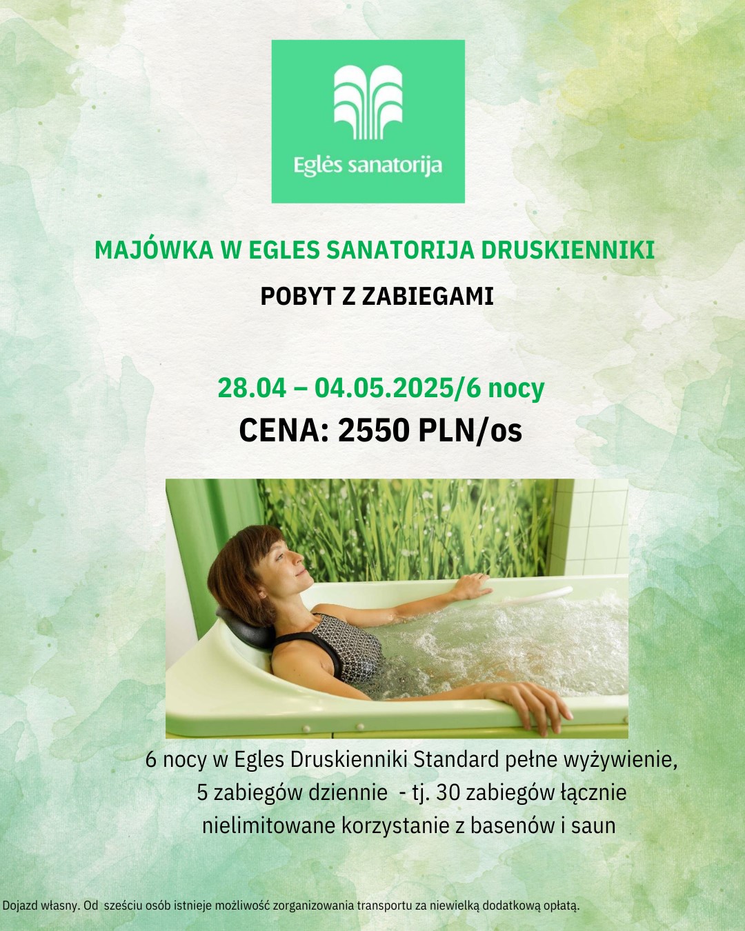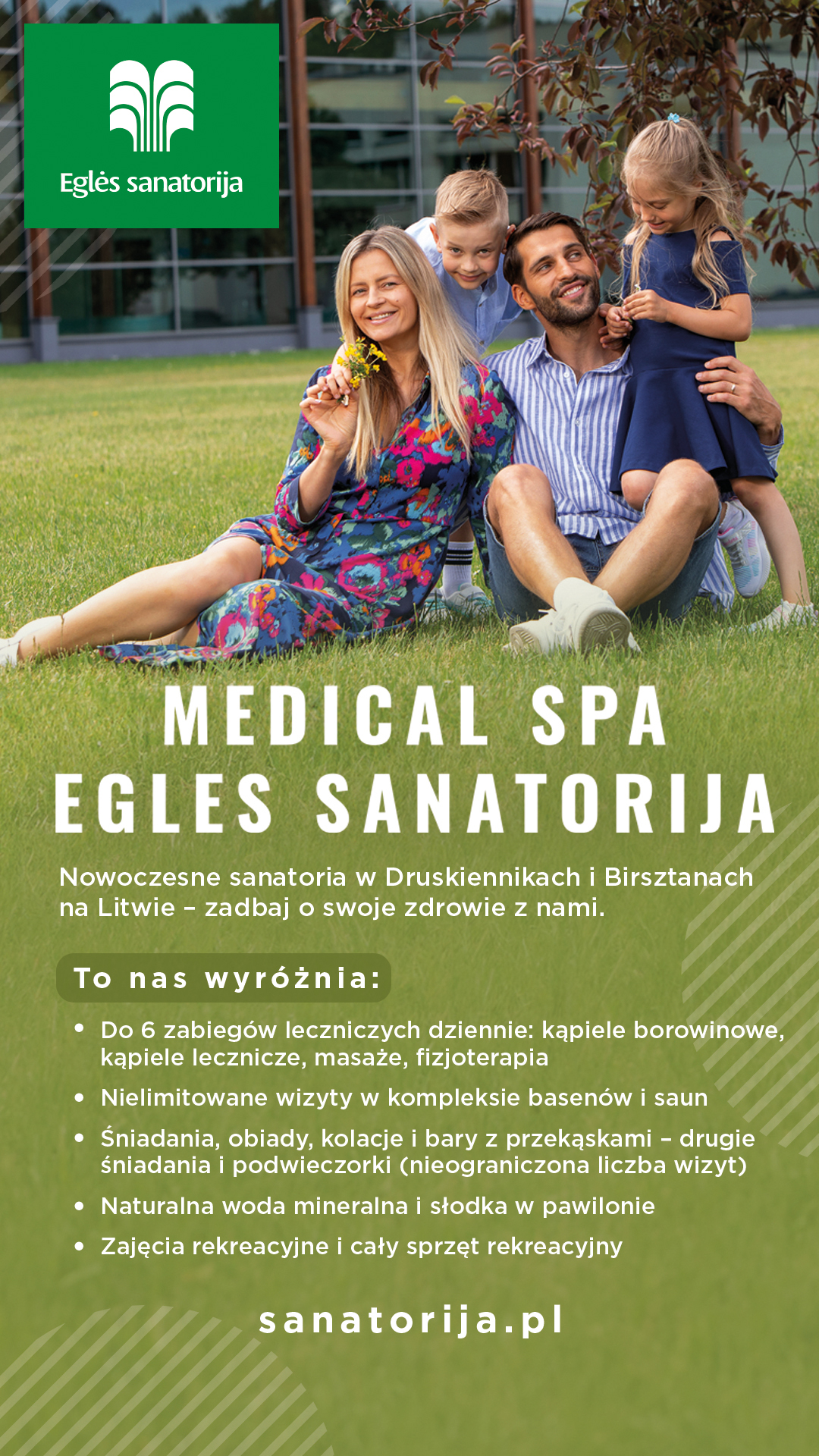 Od tej jesieni poszerzamy ofertę pobytu w Druskiennikach i w Birsztanach. Nasi klienci mogę teraz korzystać ze znakomitych sanatoriów Egles, które słyną z bardzo bogatej oferty zabiegów. Proponujemy wyjazdy indywidualne i grupowe. Osobom poszukującym spokoju szczególnie polecamy Birsztany. Jest to niewielka zadbana, pełna uroku miejscowość położona nad meandrującym w tamtej okolicy Niemnem. Szczegóły wkrótce.
